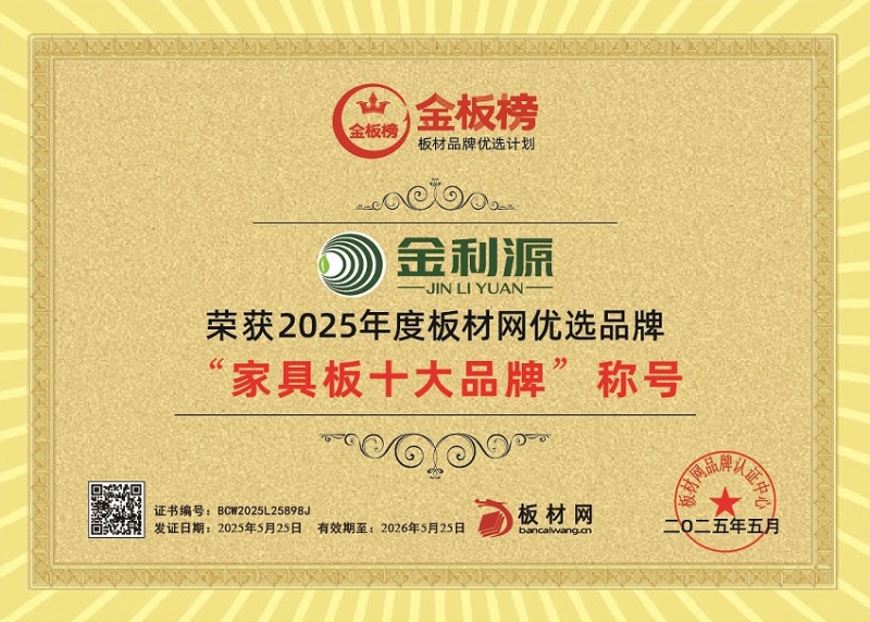 在竞争激烈的建材家具市场中,金利源凭借卓越的品质与持续的创新脱颖而出。近日,2025 年板材网“金板榜”评选活动结果揭晓,金利源一举斩获“生态板十大品牌”、“家具板十大品牌”、“阻燃板十大品牌”三项重量级荣誉,这不仅是行业对金利源的高度认可,更是其多年来深耕建材领域、不断追求卓越的有力证明。